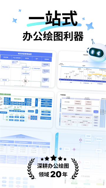 助力制作工作流程图、组织框架图、网络图表、项目管理、甘特图、鱼骨图等提高办公效率;轻松完成采购流程、会议纪要、年度总结、季度汇报、PPT制作、海报折页制作。