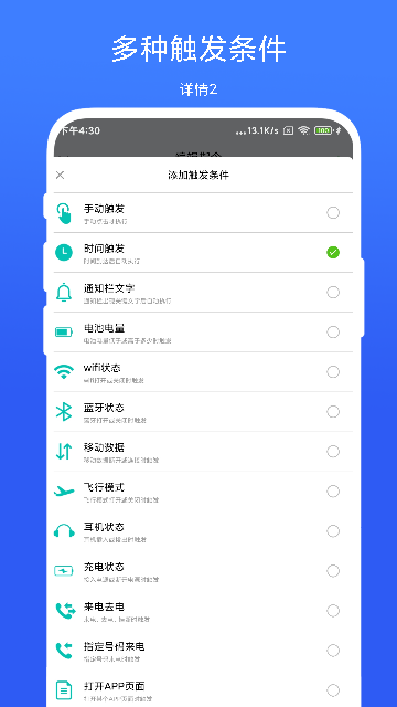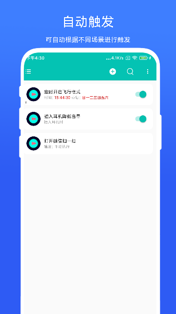 1.多维触发条件:支持时间、位置、设备状态(电量、耳机插入)、传感器(摇动、亮度变化)等触发源,精准适配各类场景。