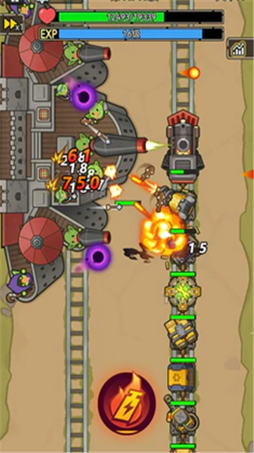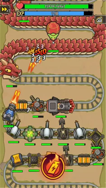 3、放好炮塔后点击开始战斗火车会自动前进,车厢上的炮塔也会自动攻击,点击屏幕中间的按钮可以加速火车和炮塔攻速。