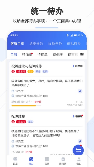1.业务处理:覆盖客户服务、任务分配、后勤管理、巡更管理等场景,支持设备巡检、仓库调度等精细化操作。