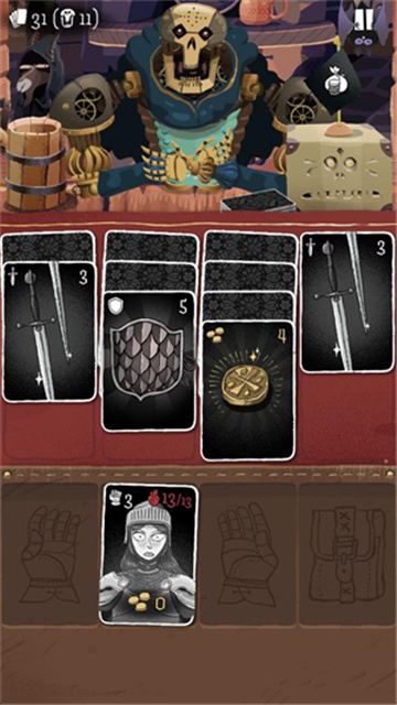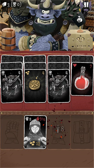 3、最下方的角色卡牌是你的英雄,英雄卡牌的左右两侧是装备栏,除怪物牌和金币牌外,将其他卡牌拖动到装备栏就可以使用。英雄牌左上角的数字代表可以进行的行动次数,右上角则是英雄的血量。