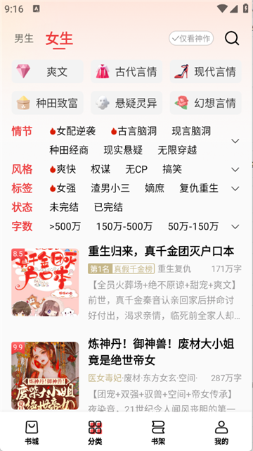 3、进入【分类】页面,小说按题材精细划分,如玄幻、都市、言情、悬疑、穿越、重生等,满足不同阅读兴趣。