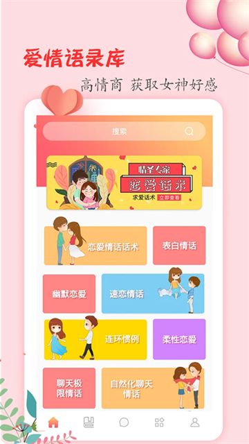 1、打卡恋爱学堂app,进入主页,主页有各种类型的恋爱话术(恋爱情话、表白情话、幽默恋爱、速恋情话、柔性恋爱等),选择用户需要的点击打开;
