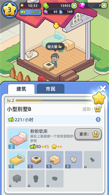 游戏进程的推进,你将解锁风格多样的建筑。充满欢声笑语的美食屋、活力四射的喷泉公园、直插云霄的摩天大楼、悠悠旋转的田园风车,这些建筑将为城市勾勒出独一无二的迷人景致。