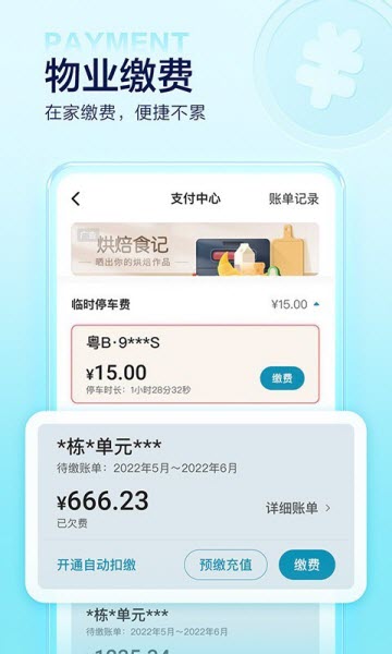 物业费、家政维修、车位月租在线缴纳,支持更多的支付方式