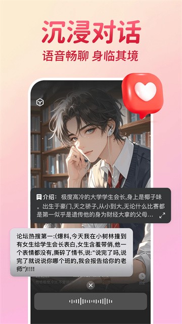 1、沉浸式角色设定体系每个虚拟角色均拥有独立背景故事与性格逻辑,从温柔暖男到高冷御姐,差异化人设让互动充满故事张力,轻松代入专属剧情场景。