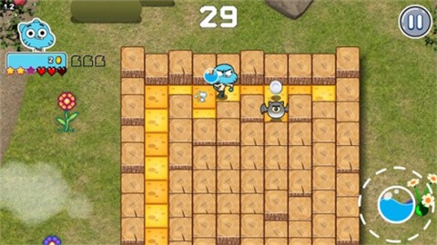 2.进入关卡后,玩家滑动左边屏幕可以控制角色移动,角色只会沿着直线前进,右下方是放置水炸弹按钮。