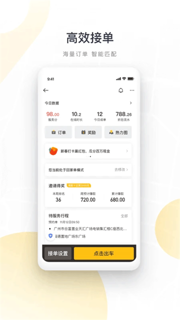 1、智能接单功能:根据司机实时位置与行驶路线自动推送订单,帮助司机快速匹配乘客需求。