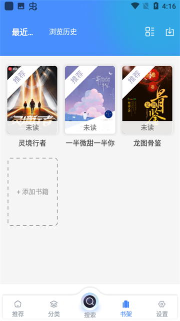 4、管理书架:将喜欢的小说一键加入书架,方便以后快速找到。同时可以对书架上的书籍进行分组命名和排序。