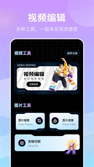 2、进入主界面后,选择视频剪裁、视频拼接、滤镜添加等功能开始编辑。