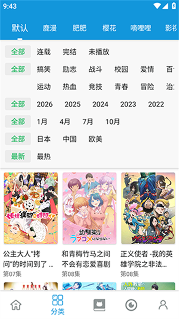 软件具备智能检索功能,根据用户的浏览历史和观看偏好,精准推送相关动漫作品,有效解决片荒烦恼。同时,兴趣分类清晰明确,热门、新番、经典等分区一目了然,让你快速锁定感兴趣的动漫领域。