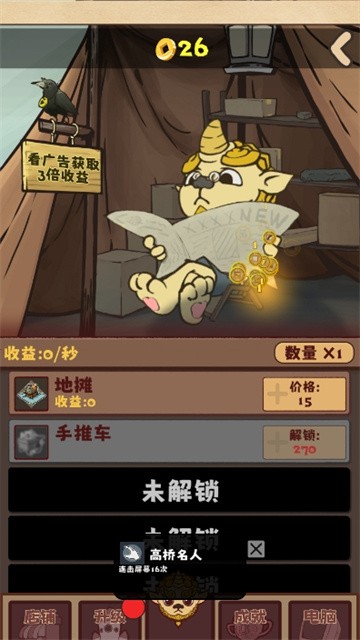一款以商业扩张为主题的地摊经营模拟手游。玩家将扮演一位创业者,从摆地摊起步,通过售卖商品、投资升级与业务拓展逐渐发展为商业巨头,游戏采用Q版小清新画风,融合放置收益与策略经营元素,让玩家在轻松点击中体验财富不断增长的成就感。