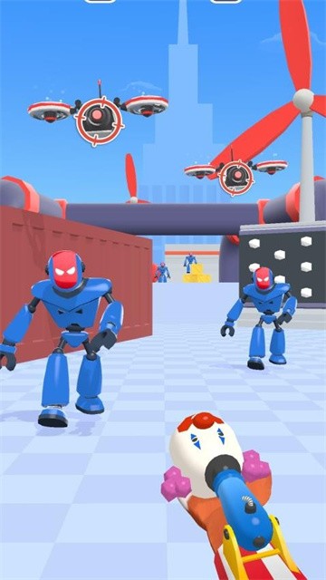 1、看见这两个机器人的时候,你可以使用专属的武器攻击它们,并且还要攻击飞在空中的无人机。