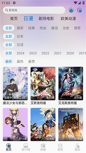 2、进入首页,可浏览平台为追番爱好者整理的多类型动漫资源,包括日漫、剧场版和欧美动漫。