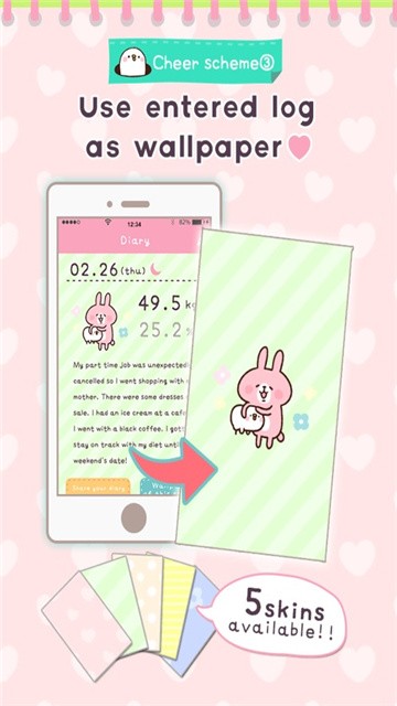 casual dieting日记是一款在日本极具人气、且自带繁体中文的体重管理APP。软件之中可以直接的让你很好的管理自己的体重以及辅助,让你完全不需要担心自己无法控制体重的问题,融入“粉红兔兔与P助”等角色元素,让整体界面更加可爱生动。