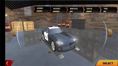 2、来到车库界面后,可以先观察上方的性能进度条,再点击右下角黄色的SELECT按钮选择或调整车辆配置。