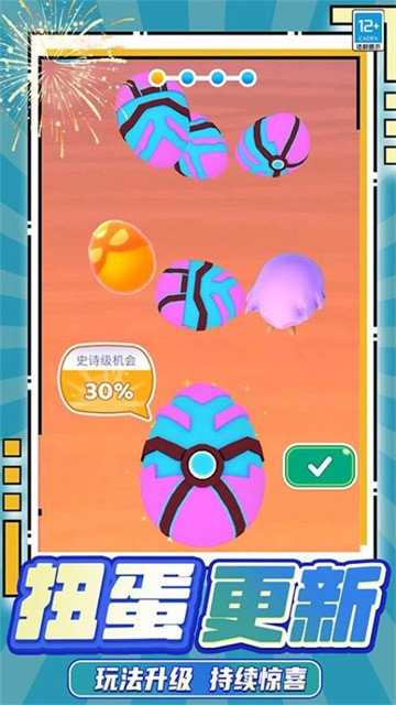 蛋蛋游乐场是一款融合了多种元素的休闲益智类游戏,游戏以别具一格的蛋蛋角色作为核心要素打造,开局就会来到自由开放的世界收集各式各样的蛋进行孵化敲打,简单触摸就会出现可爱的怪物,游戏支持多人在线联机,既可合作经营游乐场吸引游客,也可组队参与生存大乱斗,动态变化的场景(如森林、城堡)与隐藏彩蛋关卡,为每一次冒险注入新鲜挑战与探索乐趣。