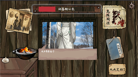 1、玩家将扮演一位樵夫,游戏开始时你位于木屋中,窗外出现了一位戴耳机的火焰头访客。桌上摆放着酒、大蒜等道具,同时界面上显示着“访客耐心条”和一些功能按钮。