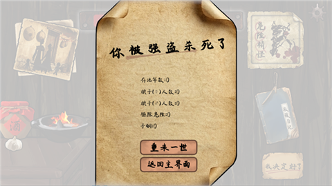4、如果判断错误,就死了,系统会显示存活年数等数据,玩家可以选择重新开始或返回主界面。