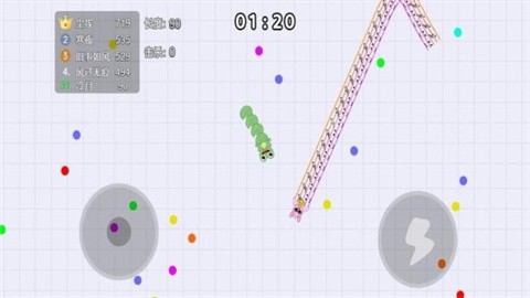 游戏提供不同颜色的食物,触碰食物就可以自动将其吞噬,快速控制角色移动,吃掉更多食物
